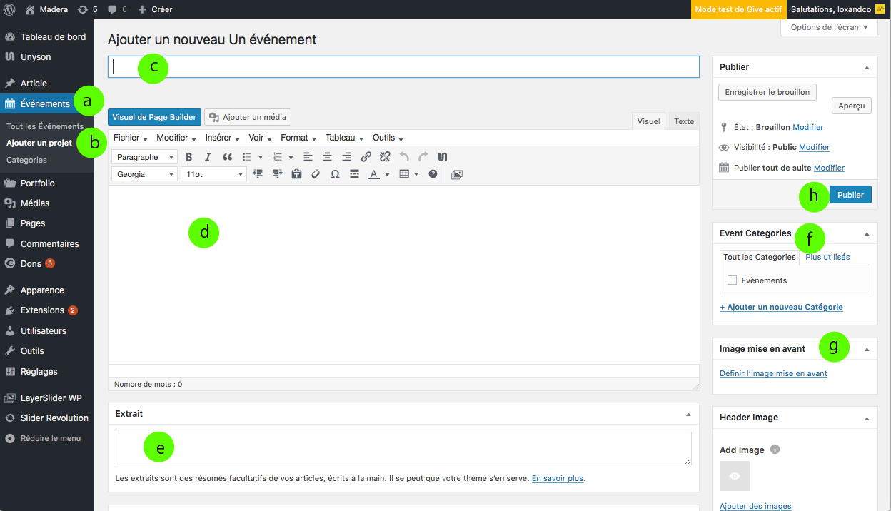 3. Dans la partie centrale, remplissez les champs «titre»ⓒ, «texte»ⓓ et «extrait*»ⓔ