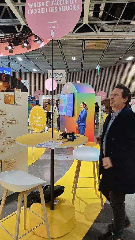 Notre présence sur le pôle “Solidarité et Vivre-ensemble” a mis en lumière une réalité préoccupante : les acteurs associatifs engagés spécifiquement sur les questions migratoires sont encore largement sous-représentés dans leur liens avec les collectivités et Mairies. À l’exception de MADERA et de notre partenaire J’accueille, aucune autre organisation abordait les enjeux de l’accueil et de l’insertion des personnes exilées. Pourtant, les collectivités locales, et en particulier les mairies, peuvent jouer un rôle clé dans l’accueil digne des personnes réfugiées. À l’image des Maisons des Réfugiés soutenues par les Villes de Paris ou de Rennes, ce sont les communes qui peuvent impulser des lieux ressources de proximité, ouverts à tous et favorisant le vivre-ensemble. Notre participation à cet événement a confirmé la nécessité de renforcer les liens entre les organisations de la société civile, les collectivités locales et les entreprises, dans une logique de coopération territoriale et d’innovation sociale. Elle a aussi montré à quel point il est crucial de rendre visible l’action associative dans les lieux de décision, afin de porter collectivement des politiques locales inclusives.